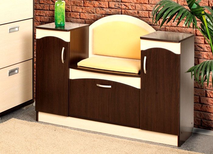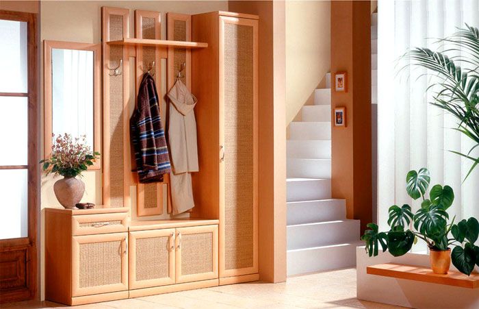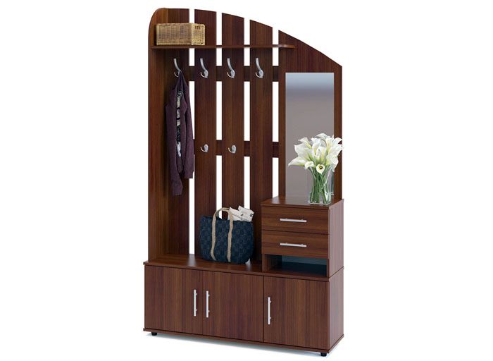 הרכב רהיטים שלם, שבו לא רק נעליים מונחות מאחורי הדלתות הסגורות של התאים התחתונים, אלא גם כובעים מעל, ובגדים עליונים במפלס האמצעי, כמו גם בארון בגדים גדול.