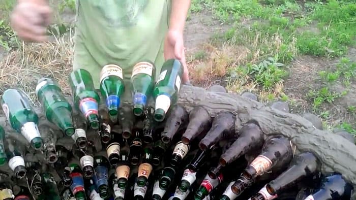 הבקבוקים נערמים גם הפוך בתעלה ומכוסים באדמה. כדי לחזק את המבנה, הוא נמשך יחד עם חוט בפינות, וקושר אותו סביב ההימור המותקן.