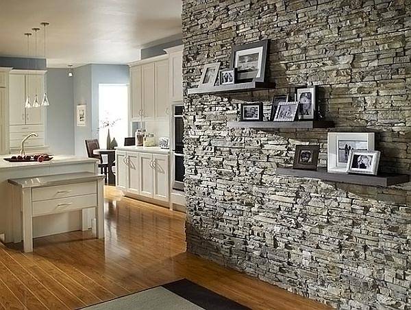 - אבן מלאכותית - בשילוב עם עץ תסייע ביצירת פנים אצילי ואלגנטי. לרוב, אבן אקרילית, כלי חרסינה, אבן בטון, אגרומרטים משמשים בעיצוב בתים. בבית בו עץ שולט, עליהם לקצץ רק חלק מהקיר והאלמנטים אָח (אם הוא כן).
