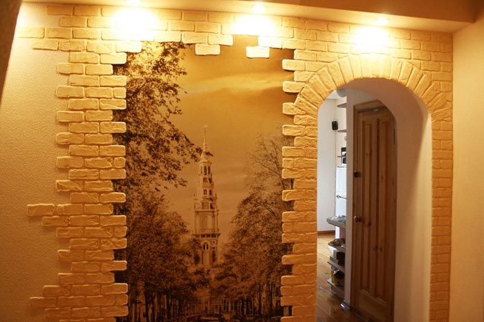 קישוט המסדרון באבן דקורטיבית: פתרונות צילום לתאורה נכונה