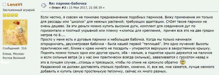 - הידוק מסגרת לא בטוח. על פי ביקורות המשתמשים, החיסרון העיקרי וכפי שהם מאמינים, בחממת הפרפר הוא חוסר האמינות של אביזר הכנף הפתוח. נראה שהם שואפים במכוון להכות אותך על הגב בזמן שהם עובדים עם שתילים. חסרון זה מתוקן על ידי התקנת תומכים אמינים.