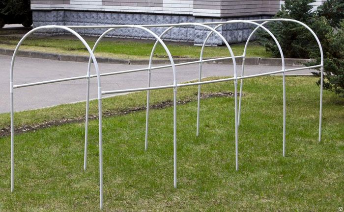 ניתן לכופף את הצינורות בקלות ולהחדירם לאבזור ליד הקרקע. כדי לאבטח את המבנה באיכות גבוהה, השתמש בקלטת מחוררת. הקשתות עשויות להיות מוטות מעט, אך כדי לתקן את הפגם הזמני הזה, קשירה עשויה מכמה צינורות ארוכים, המחוברים לקשתות באמצעות חוט.