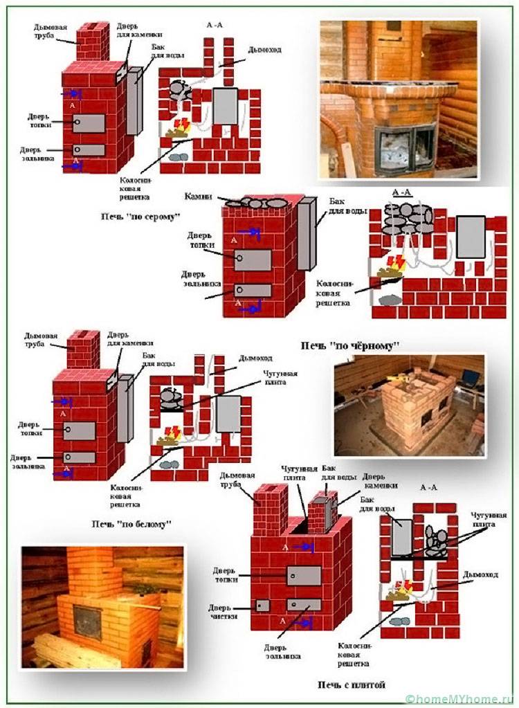 הרבה יותר קל לקנות גרסת מתכת של כיריים עצים לאמבטיה עם מיכל מים ולהתקין אותה עם תיבת אש מרחוק. תנור לבנים יהיה הרבה יותר יקר וקשה יותר לבנייה. אך חיי השירות ואיכות תיבת האש טובים יותר עבור גרסת הלבנים של חימום חדר האדים.