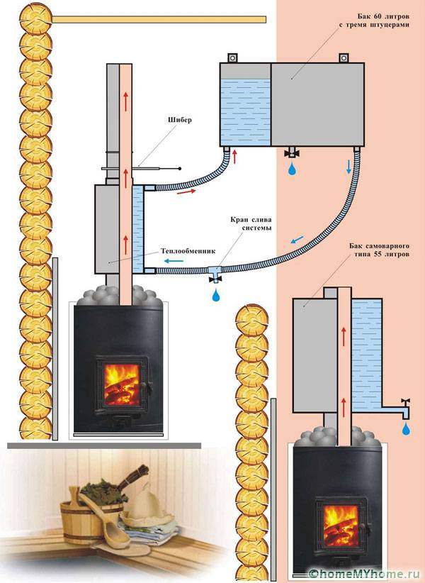 תנורים לאמבטיה עם עץ עם מיכל מים: סוגים ובנייה במו ידיכם