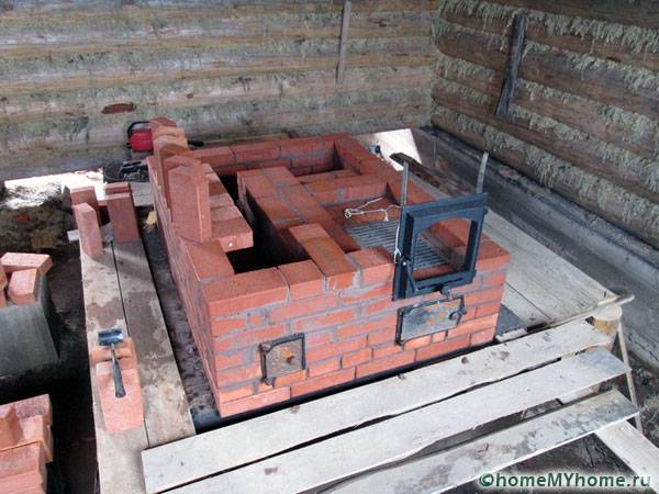 לבני הכיריים מבוצעות באמצעות טיט חרסית. הלבנים מונחות בהתאם לסדר הנבחר ומשאירות תפר בעובי של לא יותר מ -5 מ"מ. מומלץ לבנות את בסיס תיבת האש מ לבני אש... כדי לא לעכב את הבנייה, עדיף להצטייד תחילה בדלתות, תפסים, סורגים ופנקס מים.