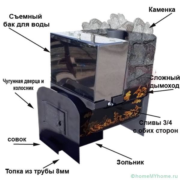 כידוע, המטרה העיקרית של הכבשן היא לחמם את בניין חדר האדים לזמן מסוים. על מנת לעבוד עם העברת חום מקסימאלית, הם מצוידים באלמנטים המבניים הבאים: