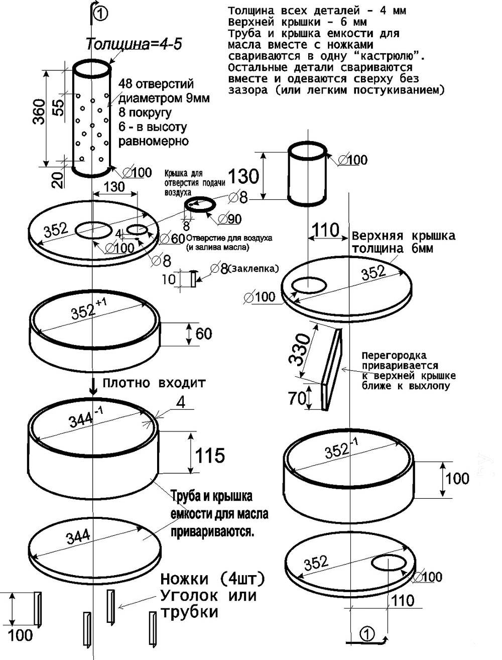 בשרטוטים המוגמרים של תנור השמן הפסולת תוכלו למצוא את הממדים הספציפיים של חלקים מסוימים. אם הם לא מסומנים, עליך לבצע מדידות בעצמך.