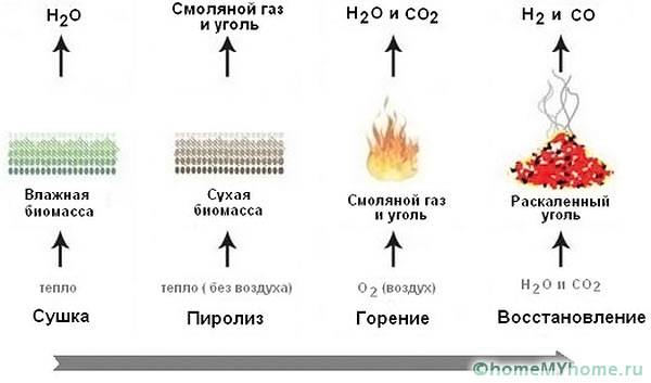 פירוליזה היא תהליך דו-שלבי שבו קודם מגרים את ייצור גזי הדלק ואז נשרפים. לשם כך מבעירים את הדלק המוצק ומאפשרים לו לעבוד ואז אספקת החמצן מצטמצמת ומגרה את ההלחמה. שריפות עצי הסקה בטמפרטורה של 200 - 800 מעלות, חומרי פחם ופחמימנים מריחים בטמפרטורות של עד 1300 - 1500 מעלות. במקרה זה, גזים משתחררים באופן פעיל, שבתנאים אטמוספריים הם מעט פעילים או אינרטים.