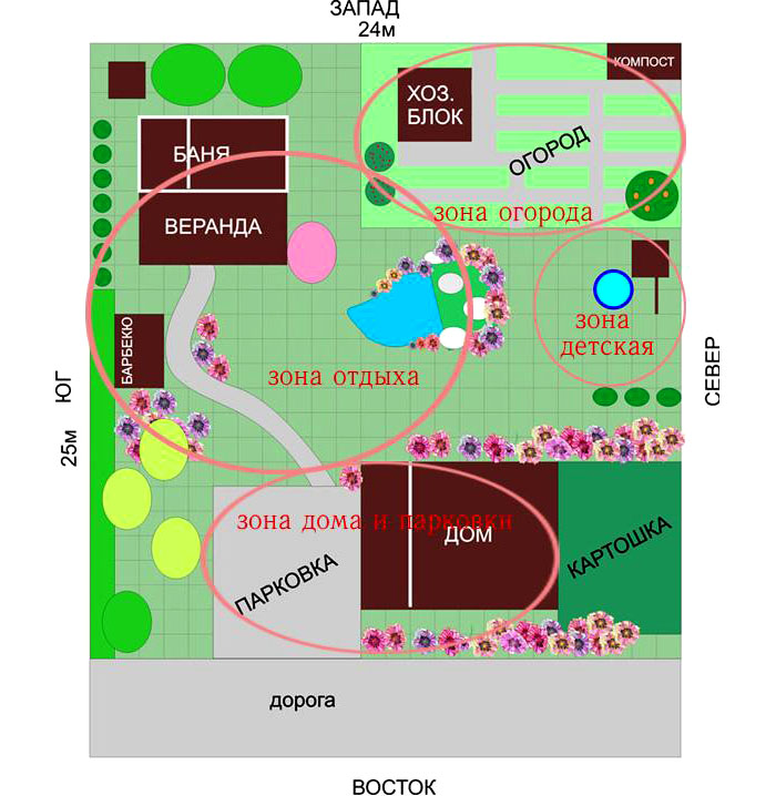 ראשית, האתר מחולק לאזורים, באמצעות גינון אנכי, עששיות, שבילים להבדיל. רצוי לחלק את השטח כך שאפשר יהיה בצל ובשמש בזמן מנוחה. שש מאות מ"ר מאפשרים לך לבנות ביתן למטרה זו, כמו גם למצוא פינה לספסל פתוח מהשמש.