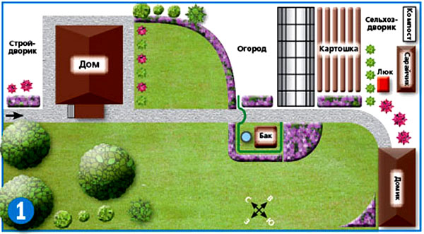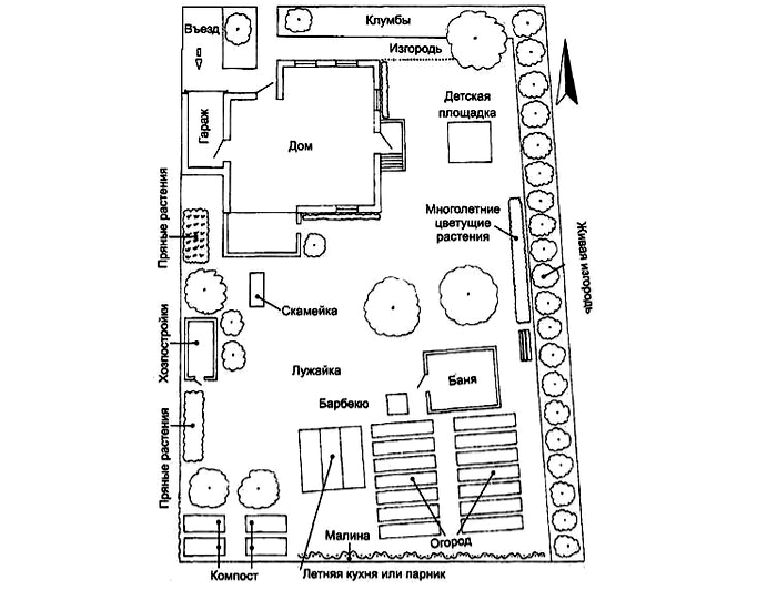 זה קשה יותר עם פריסה צרה, אבל הכל גם מוכרע. מבנים צריכים להיות ממוקמים כך שיהיה בית בחצר, לפניו יש חצר עם פינת ישיבה, ומאחוריה גן או גן ירק עם בניין חוץ. אתה יכול למקם את הבית בקצה אחד של החלקה, ואת שאר הבניינים בקצה השני. אזור בילוי וגן ירק ממוקמים באמצע.