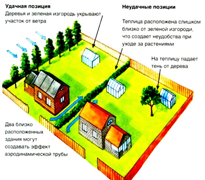 בהתאם לסוג הבניינים, נבחר מקום גם: לא ניתן להסתיר את בית המרחץ מהעיניים, אך הסככה והסדנה עשויים להיות ממוקמים רחוק יותר.