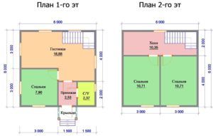 דוגמה נוספת לפריסה מלבנית היא פרויקט של בית בגודל 6 על 10 מ '. הוא כולל הצבה של חדרים מכוונים לאורחים בקומה הראשונה, וחדרי שינה לאנשים שגרים בבית בקומה השנייה. יש מספיק מקום לספק חדר הלבשה ואפילו חדר כושר קטן.