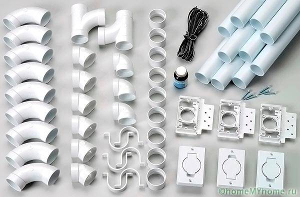 ללא קשר לחומר, לחתך רוחב, כל צינורות האוויר הפולימרים הושלמו עם אביזרים, אלמנטים נוספים. צינורות מורחבים עם שקעים, מחוברים מעריצים, תנורי אוויר עם אוגנים עם אטמים.