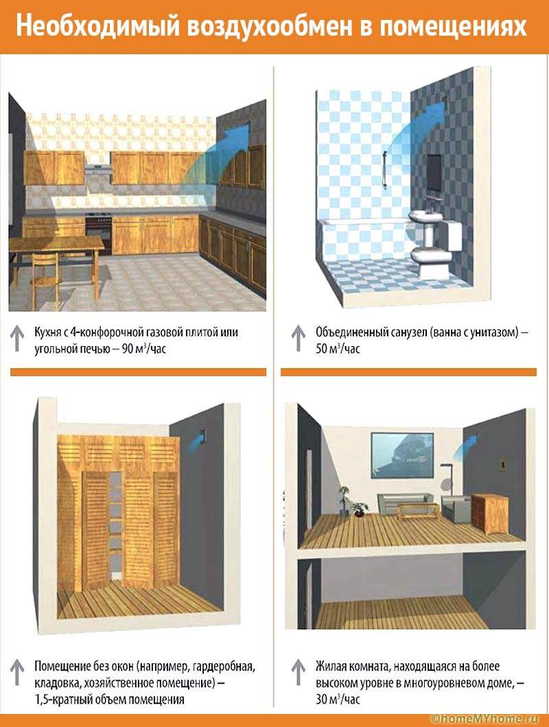 עבור בתים פרטיים, מספיק שינוי יחיד של כל נפח האוויר במקום בכל שעה. לכן דרושות צינורות אוויר מפלסטיק לאוורור חתך שכזה, כך שעם טיוטה טבעית או בעזרת מאווררים, מצב זה מובטח, או ניתן לספק / להוציא 30 קוב מהחדר מדי שעה לכל אחד מבני המשפחה.