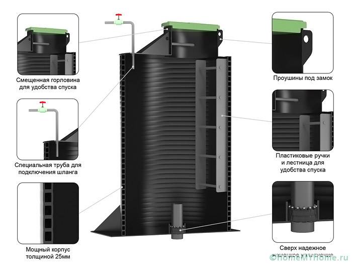 מיכלים להצבה בקרקע עשויים יריעת פוליפרופילן, השייכת לקטגוריית החומרים הקלים למדי. בניגוד לאותן טבעות בטון, הרבה יותר קל להוריד מיכלי פלסטיק לבור. לאחר ההצבה בבור, אין צורך בעבודה נוספת בכדי למלא את הרצפה ולאטום את המפרקים.