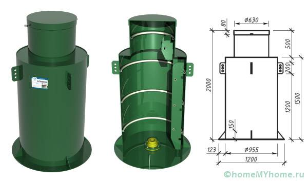 תא הפלסטיק הוא מיכל רחב ידיים בצורת גליל. הקוטר שלה יכול לנוע בין 100-150 ס"מ. באשר לגובה, הוא יכול להגיע ל -2.5 מ '. ישנם גם גדלים וצורות סטנדרטיים אחרים של מכולות, אך הם פחות פופולאריים בבנייה פרטנית.