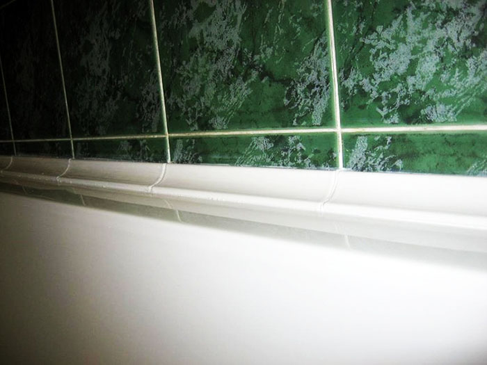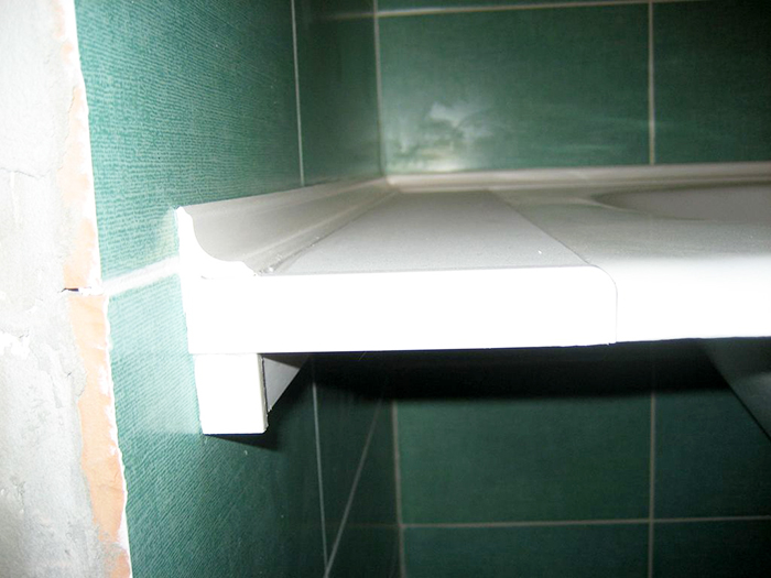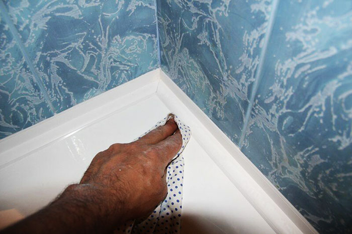 יתר על כן, חומרים עודפים מוסרים משטח הפינה בין חדר הרחצה לאריח, אם יש צורך, התפרים ממולאים בנוסף באותו חומר איטום.