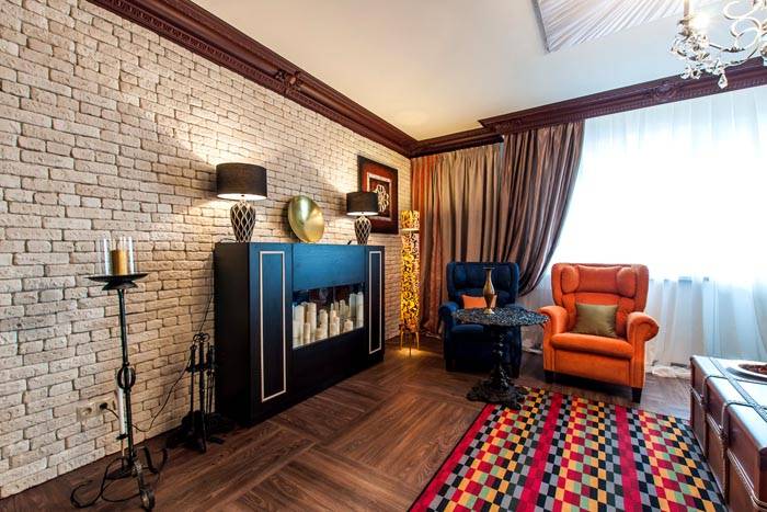 לפיכך, עליכם להיות מוכנים לכך שכשחושבים על גימור כזה, אתם עלולים להיתקל בקשיים מסוימים. אך התוצאה היא בדרך כלל מעבר לשבחים. והנה איך נראה הסלון המחופה באריחים דמויי לבנים בפנים.
