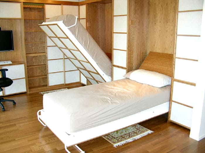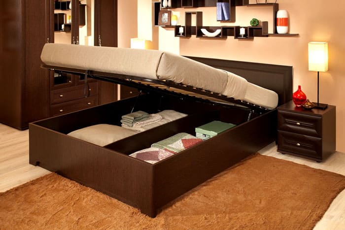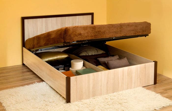 מומלץ להשתמש באופציה השנייה בדירות שני חדרים. במקרה זה מוקצה חדר קטן יותר עבור חדר שינה, גם אם אין מקום לארון או לריהוט אחר.מקום שימושי לאחסון דברים ומצעים שונים יסופק על ידי ארגז מתחת למזרן הרמה.