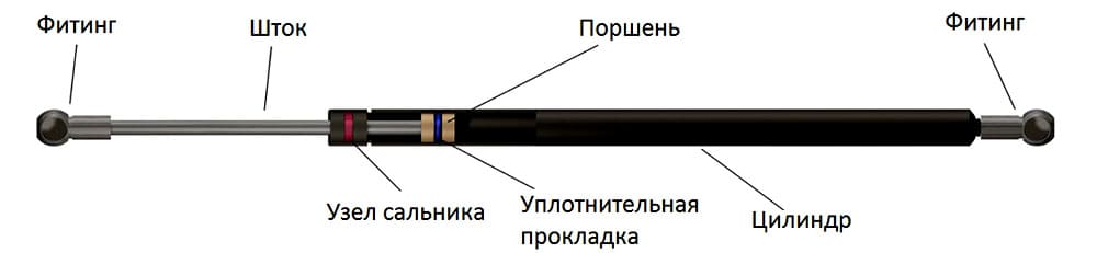 חָשׁוּב! חנקן משמש כחומר עובד בבולם זעזועים בגז, הנשאב לגליל אטום בלחץ גבוה. יש גם בולם שמן, בוכנה וחותמות. תיקון עצמאי של מעלית הגז ללא ציוד מיוחד אינו אפשרי. יתר על כן, כשל בשלמות הגליל יכול לגרום לפיצוץ חד של שמן וחלקים של האטמים, מה שעלול להוביל לפציעה.