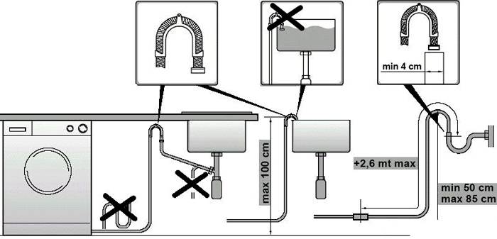 - משמש לניקוז לשירותים או לחדר האמבטיה. במקרה זה, החלק העליון של הצינור צריך להיות מותקן בגובה 60 ס"מ ממכונת הכביסה. מחברים מיוחדים יידרשו;