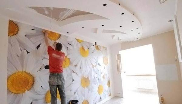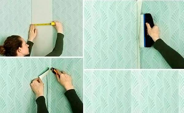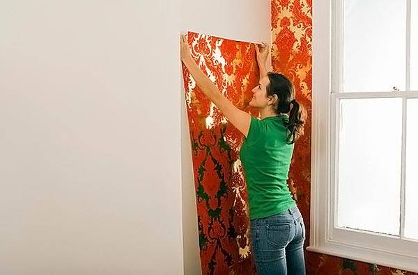 הרצועה הראשונה מודבקת לאורך קו אנכי. לא כל כך חשוב איפה להתחיל להדביק, מכיוון שטפטים כאלה מודבקים מקצה לקצה. צרף את הבד לקיר ויישר אותו מהמרכז לקצוות. האנכיות נבדקת על ידי קו אינסטלציה. בדים רחבים מיושמים בצורה הטובה ביותר מהזווית הגלויה ביותר. ניתן לגלגל צבעים רגילים בעת ההדבקה ולחתוך ליד הרצפה. את הציפוי מגלגלים בעזרת גלגלת להסרת אוויר ובועות.