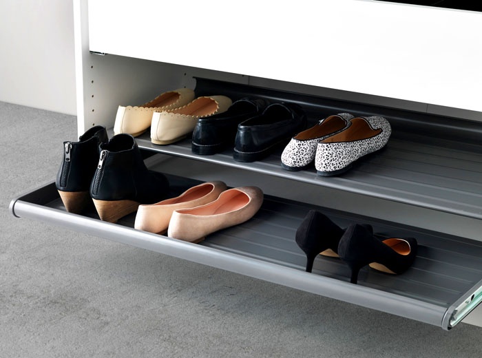 עיצובים נשלפים מיוצגים על ידי מדפים פתוחים וסגורים. העומק תלוי בתנועת הגלגל לאורך המדריכים. לא נדרשים מאמצים לכך, הכל קורה בקלות ובמהירות: הוא הקדים ומצא מיד את הנעליים הדרושות.