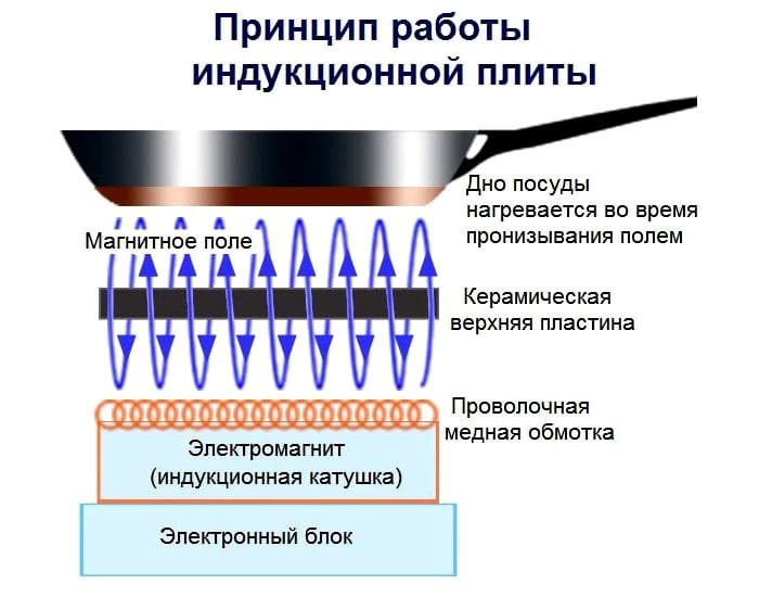 IN תנור קונבנציונאלי כל האלמנטים מחוממים, ובאינדוקציה רק החלק התחתון של כלי הבישול יהיה חם. כל מהות העבודה טמונה ביצירת שדה מגנטי על פני המכשיר, שנוצר על ידי זרמי מערבולת, על פי עקרון האינדוקציה. כלומר, אם בתחתית הכלים אין תכונות פרומגנטיות, אז לא תהיה חימום.