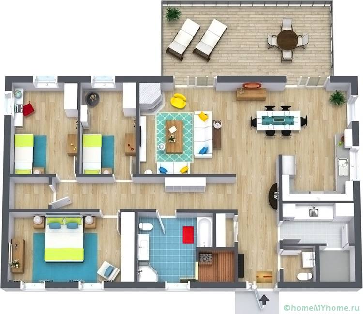 מַעֲרָך בית בקומה אחת עם שלושה חדרי שינה לוקח בחשבון את המאפיינים הגיאודטיים של השטח ואת המדרון שלו. גם מיקום החצר חשוב. אפשרויות העיצוב הקלאסי כוללות חדרי שינה, אזורי מגורים גדולים ומטבחים. במקרים מסוימים, במקום גג, אתר מצויד, עֲלִיַת גַג או בעתיד מתוכנן לבנות קומה שנייה.