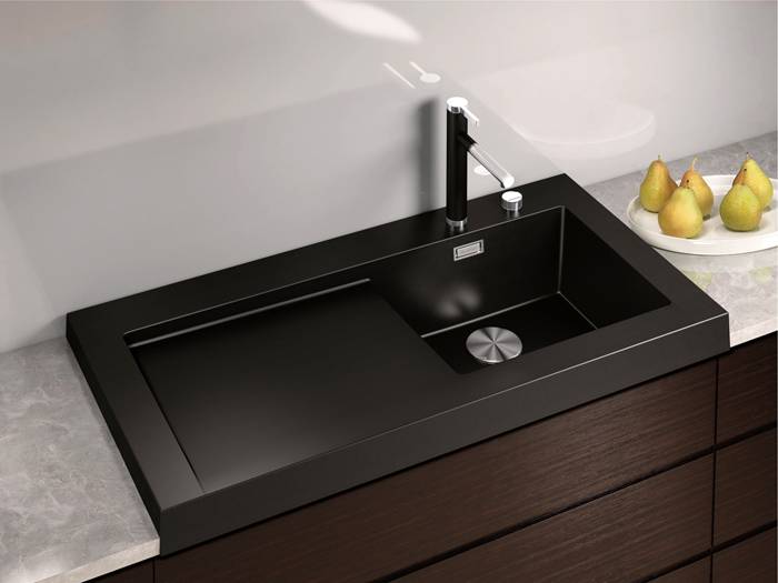 - הכיור השחור למטבח נראה נהדר על רקע לבן