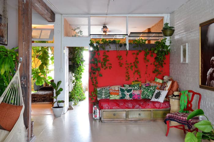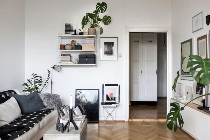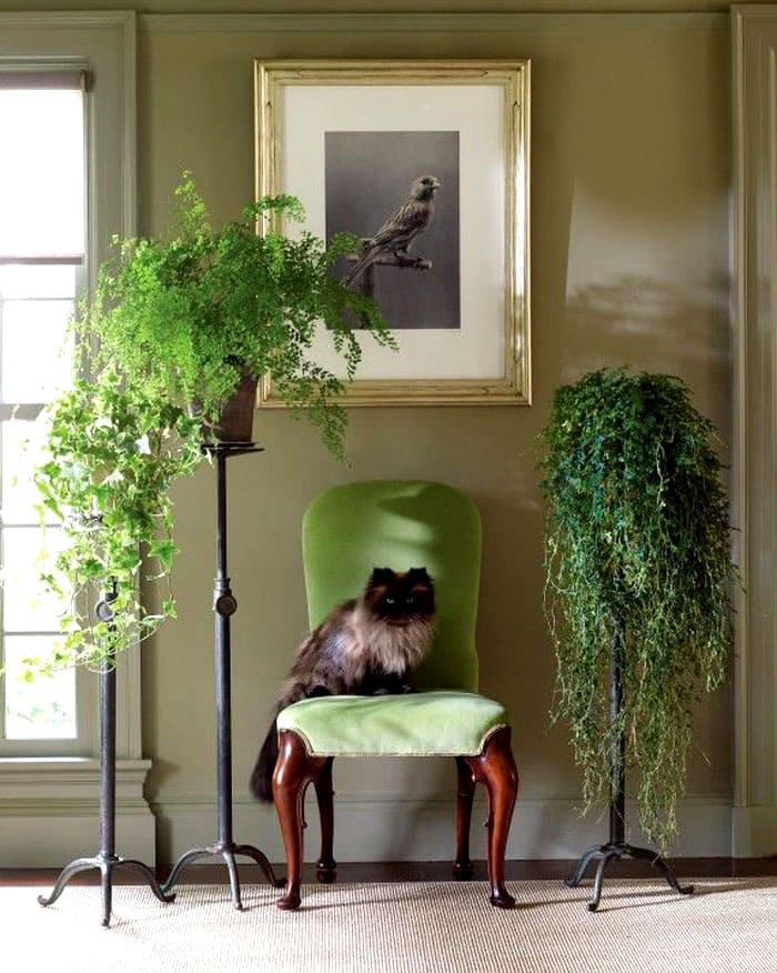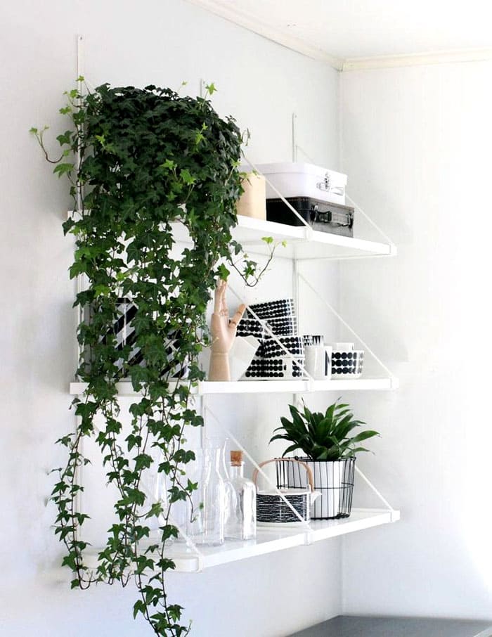 פרחים יכולים ליפול על הקירות כתושבי מדפים או סירי קיר מיוחדים. מחפשים במקום בין ספרים, פסלונים, בין ציורים.