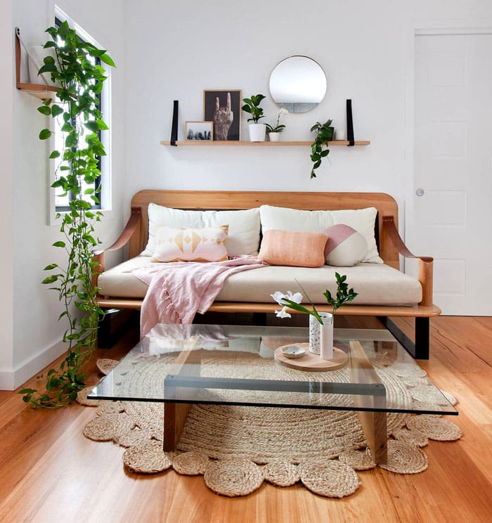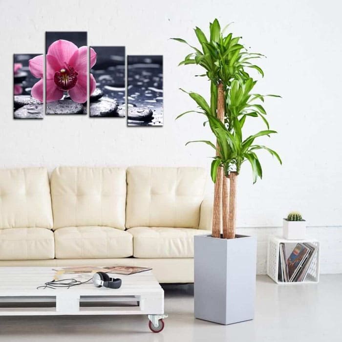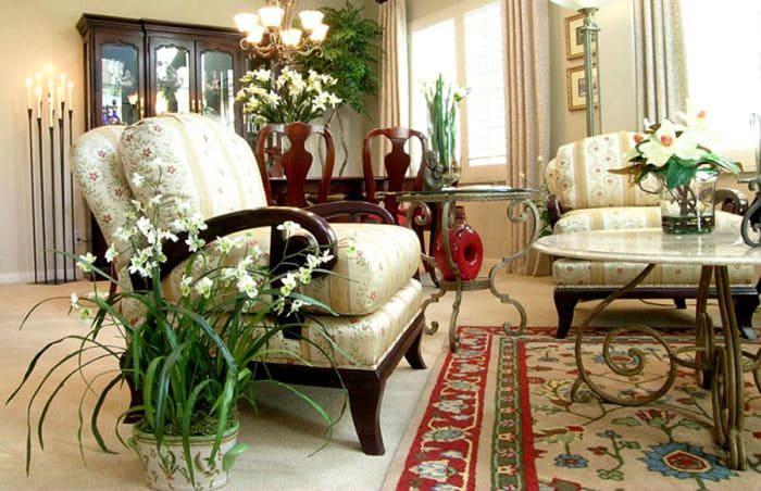 לסלון, אנו משאירים עצים גדולים באמבטיות: היביסקוס, עץ דולר, כל מיני עצי דקל, vriezias, פיקוסים. כדאי לנסות לסדר על שולחן הקפה אנתוריום או ספתיפילום.