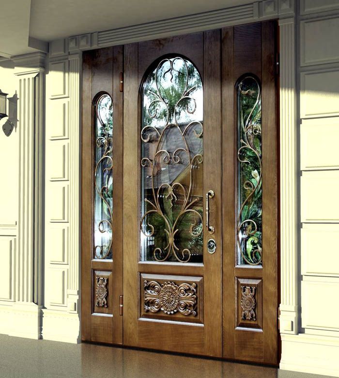 משטחי זכוכית בדלתות הכניסה לכניסה (כמו בתמונה) מכוסים בגריל מגן. פתרונות כאלה אינם משמשים בדירות. עם זאת, משתמשים בכיסויי זכוכית דקורטיביים. חלקים כאלה שבירים, ולכן הם מותקנים על אטמי דעיכה. הם עמידים במיוחד וקלים לניקוי.