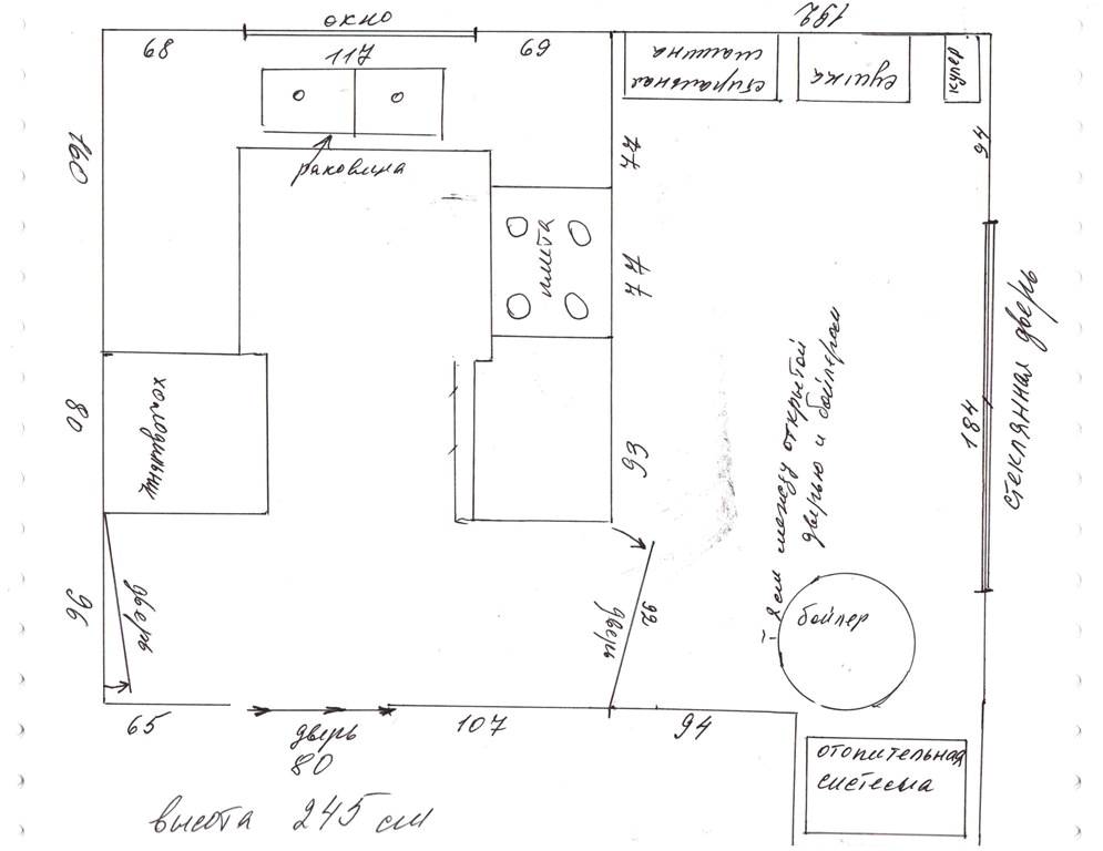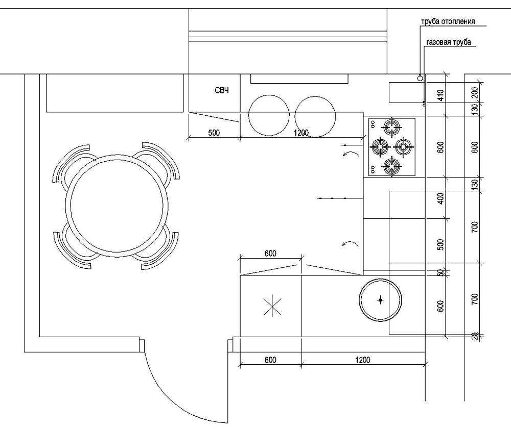 כאן תוכלו לראות את המקומות שבהם מותקנים הכיריים, הכיור והאלמנטים האישיים של רהיטי הארון. ברור לאיזה כיוון יפתחו הדלתות וכמה מקום צריך למגירה.