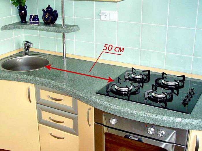 מידע מועיל! הכיור, הכיריים והמקרר מותקנים קרוב אחד לשני, מכיוון שהם משמשים לעתים קרובות. אך יש צורך להשאיר פערים טכנולוגיים להצבת מוצרי מזון, מנות.
