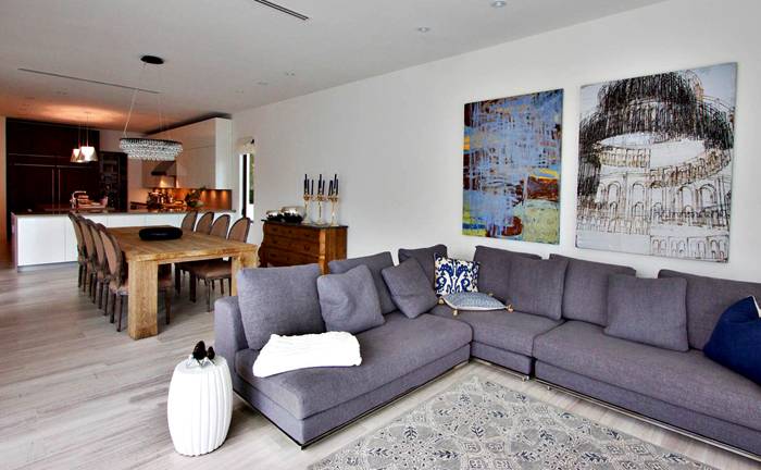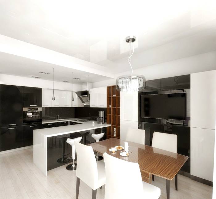 חדרים גדולים משלבים מטבחים עם אזורים פונקציונליים אחרים. זה יוצר מקום רב, אך הדרישות להזמנה גדלות. כדי להסיר ריחות זרים, יש צורך להתקין ציוד אוורור חזק מספיק.