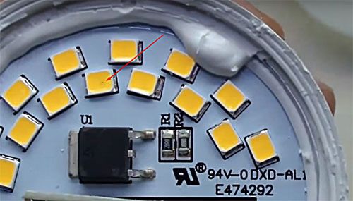מתחת למעטפת השקופה השקופה, בסיס המגע, הבית, נהג ולוח מוליכים למחצה. המשימה של הנהג היא להוריד את הזרם של 220 וולט, סטנדרטי עבור הרשתות שלנו, לערך הנדרש להפעלת מוליכים למחצה. לוח חשמל ובקרה זה יכול להיות מסודר בדרכים שונות בהתאם להחלטת היצרן. כדי להפחית את העלויות שלהם, חלק מהיצרנים הלא מאוד הגונים לא מתקינים על הלוחות הדרושים לרשתות שלנו מייצבים... כתוצאה מכך הנורה בוהקת מאוד, אך לא לזמן רב. דיודה אחת לא זורחת מספיק חזק, ולכן הם מקובצים בנורות בכמה חלקים על הלוח, ומשלבים אותם למעגל אחד. אם אחד ממוליכים למחצה אינו תקין, המנורה כולה לא תישרף.
