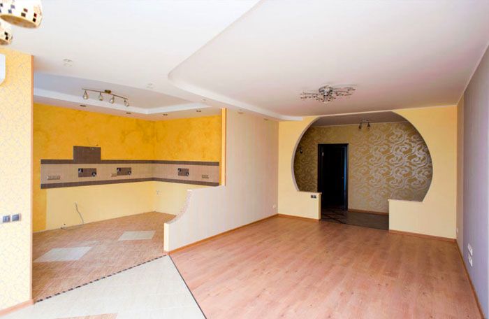תמונה זו מראה כיצד ניתן לשלב שני חדרים על ידי פירוק מחיצה. במקרה זה, האחרון אינו מפורק לחלוטין. האפקט נוצר יעוד שטח גדול... יחד עם זאת, הכל מודגש היטב על ידי תקרה עם מבנה תלוי בצורות שונות. כלומר, בדרך זו לא רק המחיצה מילאה תפקיד של מבנה תוחם, אלא גם את התקרה. עם מורכבותו לכאורה של התיקון, עלות יישומו היא למעשה מינימלית.