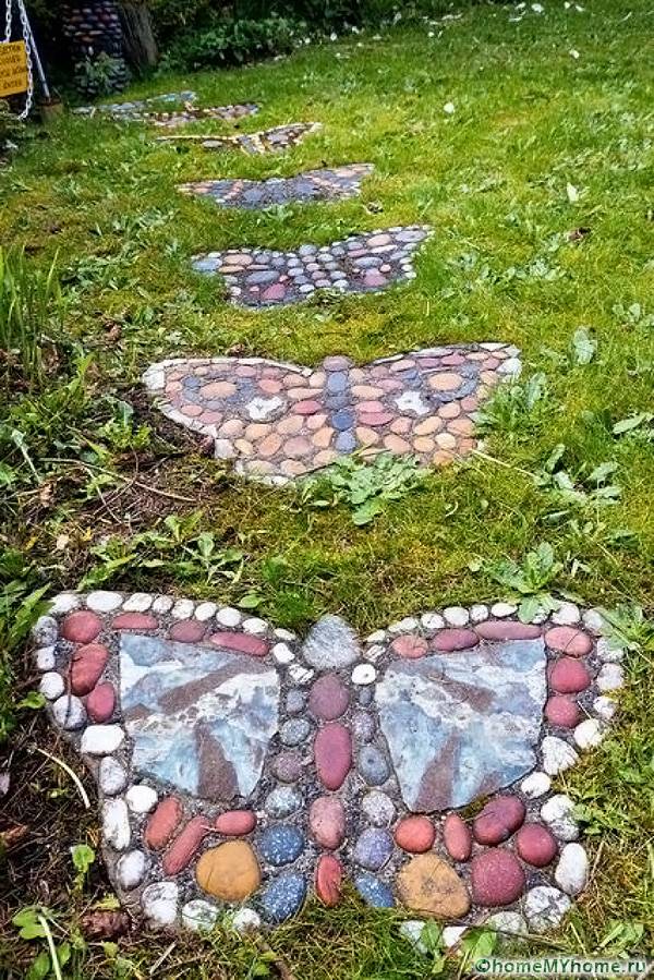 שבילי אבן טבעית יהוו המשך הגיוני לנוף האלפיני. אבנים שטוחות גדולות בגדלים ובצבעים שונים נערמות יחד עם קטנות. שיק מיוחד - שבילים עשויים חלוקי נחל צבעוניים, מונחים בדוגמאות. שביל גינה כזה ייקח המון זמן וסבלנות, אך התוצאות יהיו שוות את זה. האבנים מונחות על טיט מלט. ציפויים כאלה הם נצחיים כמעט, אינם דוהים ואין צורך לטפל בהם. שבילי גן DIY, תמונות של שבילי חלוק נחל: