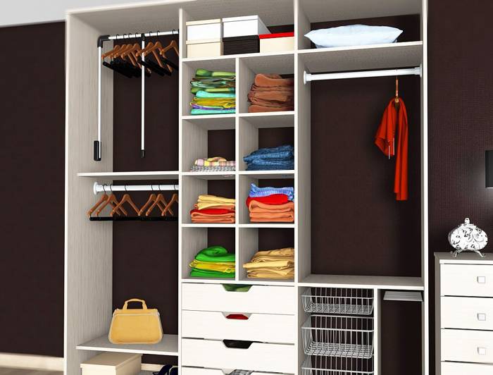 - מובנה. כל נישה מתאימה לעיצוב ארון בגדים.התקנה של מערכת כזו היא קלה יותר, מכיוון שאין צורך להרכיב את הגופה, אלא רק להתקין את המנגנון, הבדים ולהפיץ את המדפים.