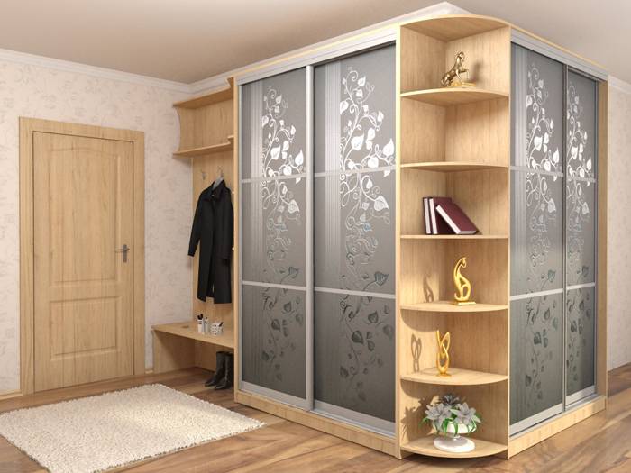 - דגמים פינתיים. לא תמיד יש מקום במסדרון להתקנה ישירה של ארון בגדים, במצבים כאלה מותקנות אפשרויות פינתיות, מה שחוסך משמעותית מטרים רבועים של דירה. עיצוב כזה יכול להתבצע בצורת האות "L", משולש או טרפז, ולכן זה תענוג להחיות פרויקטים של עיצוב עם רהיטים כאלה.
