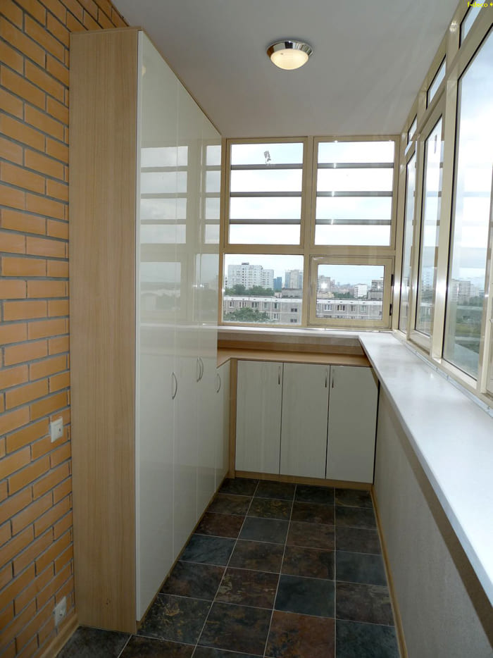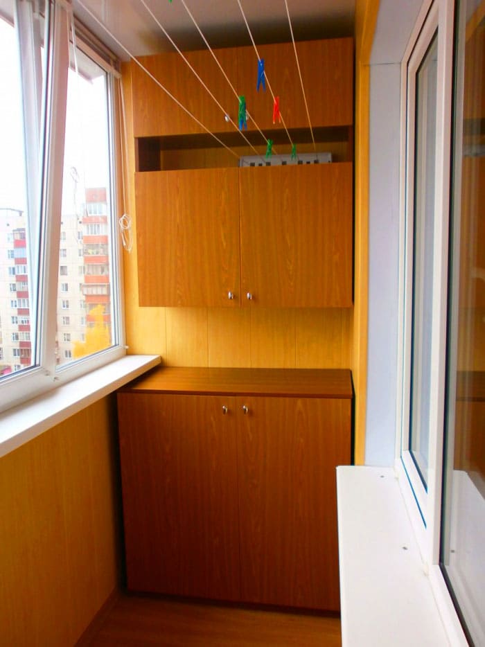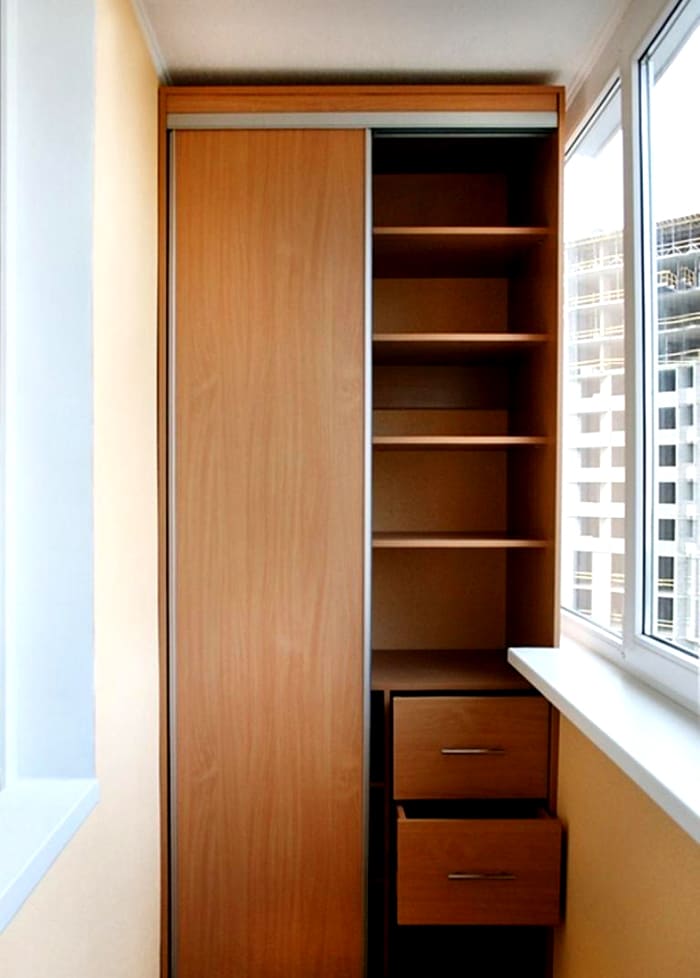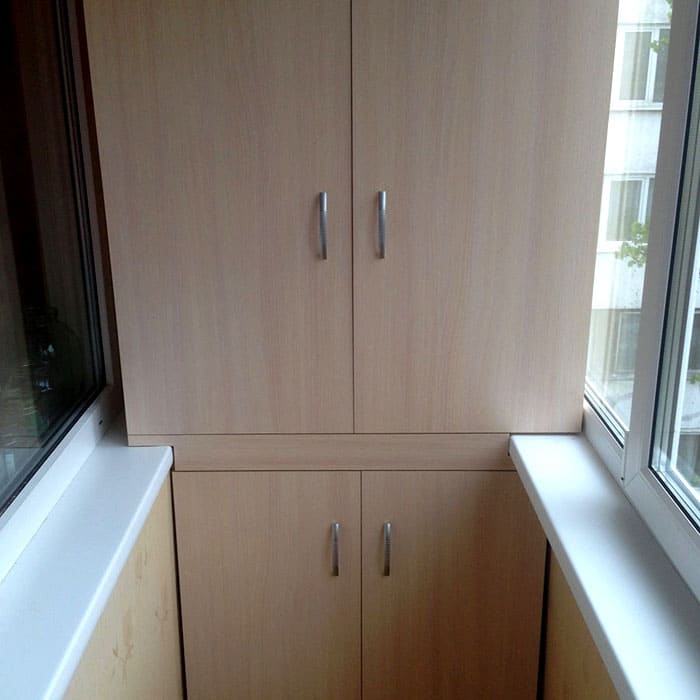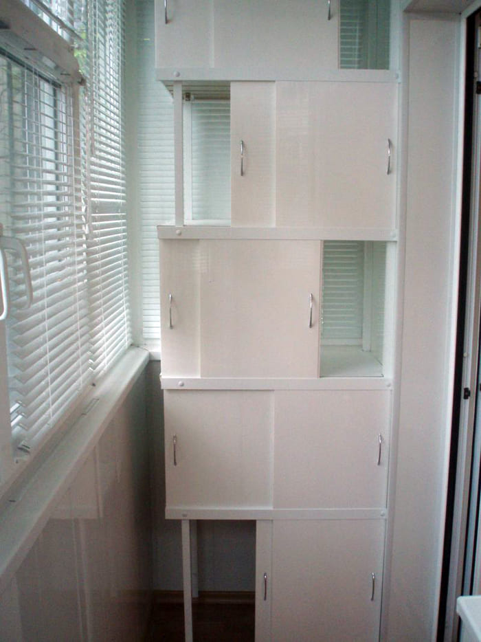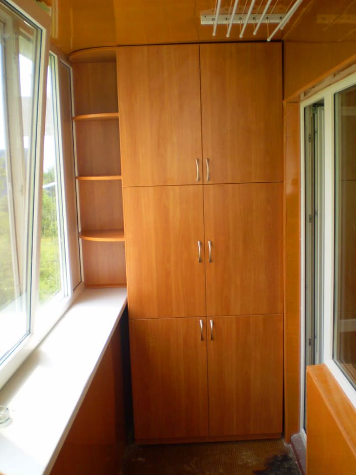 אם אדן החלון בולט, אז זה יפריע לארון הפתיחה הסטנדרטי. לחלופין, תוכלו לבחור את תצורת המוצר, שדלתותיה ממוקמות מתחת לגובה אדן החלון או מעליו. אתה יכול אפילו להתקין אובייקט אחד על גבי אחר. החלק התחתון יכול לחזור על רוחב המרפסת, והחלק העליון יכול להיות קטן יותר.
