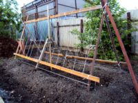 - בצידי המיטה, סעו שני תומכים לעומק של 0.6 מ ', המרחק ביניהם צריך להיות עד 2 מטר. אתה יכול לחדד את קצות ההודעות, ואז הם ייכנסו ביתר קלות לקרקע. יש לדחוס את האדמה.