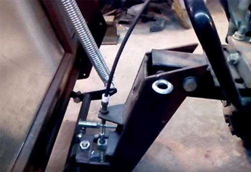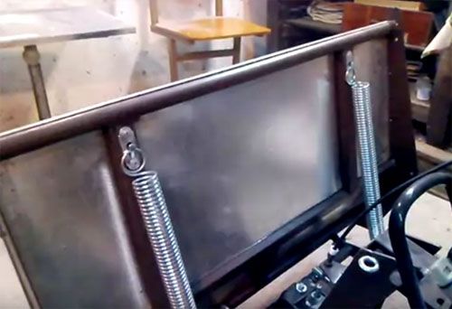 אתה יכול להתחיל לעשות את הגוף מהצדדים. במקרה זה, שני עיגולים נחתכים מהמתכת. יריעות מתכת מכופפות לחצי עיגול מרותכות לחלקי הצד. חורים עשויים בחלקים הצדדיים בהם מוחדר מנגנון הקידוח. המסגרת מיוצרת על ידי ריתוך צינורות בצורת המסגרת. במקרה זה, תחנת הכוח חייבת לנוע לאורך המסגרת, וגם להיות קבועה במצב הרצוי. הידית עם הוצאת שסתום המצערת קבועה לחלק המסגרת. אם לוקחים בחשבון את סוג התבליט, רצים או גלגלים מחוברים למסגרת.