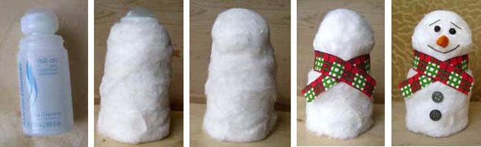 אנו מתחמשים בדבק PVA ובצמר גפן. אנחנו קונים צמר גפן לא בכדורים, אלא בגוש גדול ומוצק, רצוי בגליל. שמנו PVA על הבקבוק ועוטפים אותו בשמיכת כותנה. אל תפחדו למרוח דבק ישירות על צמר הגפן - כאשר מיובש, PVA יהפוך את המלאכה לעמידה מאוד. לאחר שיצרנו את גוף הצעצוע והמתינו לייבוש מלא, מרכיבי הפנים מוחלים בצבע ופיסת בד קשורה לדמות כצעיף.