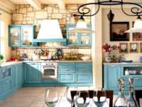 | צבעים בהירים משמשים לקישוט: פיסטוק, טורקיז, חלבי, כחול בהיר. העיצוב של הסינר נראה טוב עם חיקוי של לבנים מזוגגות. טקסטיל - עם קישוטים פרחוניים או משובץ. | הרהיטים עשויים מעץ טבעי או מחיקויו. החזית מעוטרת בפטינה, גילוף ופרזול. | סלסילות נצרים, קרמיקה משובחת, בקבוקי זכוכית עם ירקות ופירות מוחמצים, פרחים בעציצים משמשים לקישוט. |
