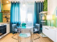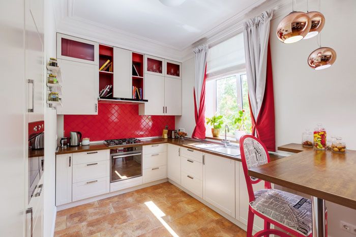 טכניקת תכנון יעילה היא השימוש בבדים בהירים כאלמנטים מבטאים. זה מתאים למטבחים קטנים ובינוניים שבהם ריהוט וקישוט הקירות נעשים בצבעים ניטרליים.