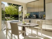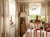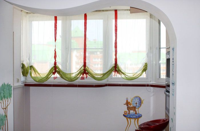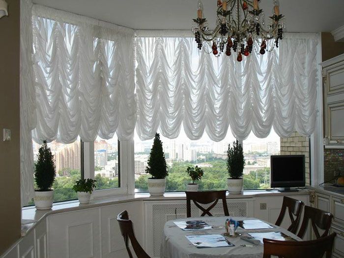 אם יש פינת אוכל ליד החלון, אז מומלץ להתמקד במרחב הפתוח - נוף לרחוב, לפארק או לפנורמה של העיר. לשם כך משתמשים בווילונות עם טול שקוף בצורת קשת. במקרה זה, אדן החלון נותר פתוח וניתן להשתמש בו בכדי להכיל אלמנטים דקורטיביים או צמחים חיים.