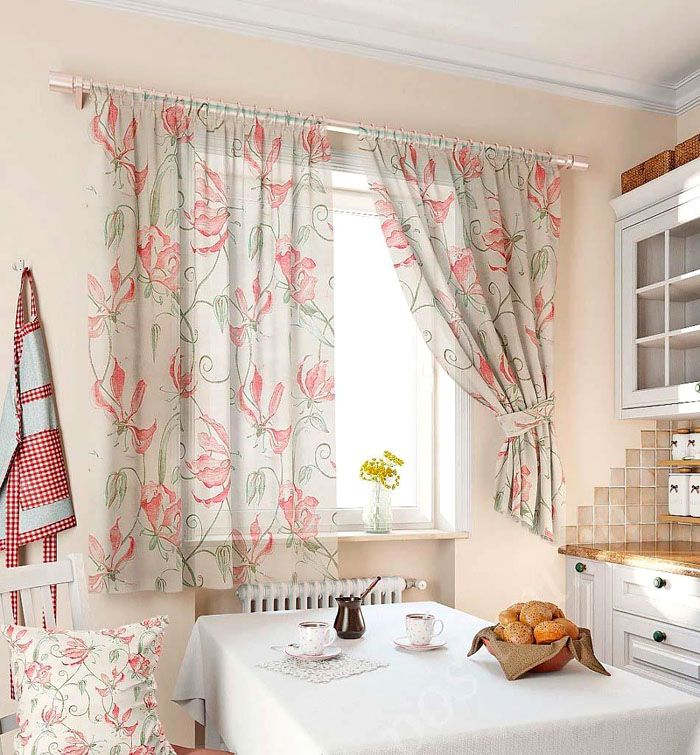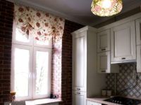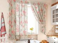 אפשרות נוספת היא וילונות בהירים עם דוגמה פרחונית או פרחונית, קשורים משני הצדדים בסרטים. נוכחות של סלסולים וסלסולים מעודדת אם החלון ממוקם הרחק מהכיריים. ישנם אתרי דפוס רבים. אפילו מתחיל יכול לתפור וילונות למטבח במו ידיו.