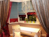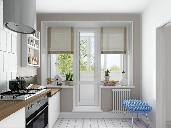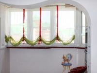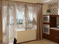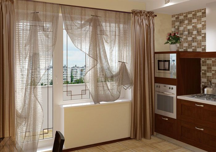 לעתים קרובות תוכלו למצוא פיתרון תכנון שכזה בעת היציאה ל מִרפֶּסֶת מבוצע משטח המטבח.סגנון הווילונות נבחר בצורה כזו שמתבצעת גישה ללא הפרעה לדלת, ופתיחתם וסגירתם מתרחשים ללא הפרעה. בעזרת תריסי גלילה תוכלו לכסות את הדלת לחלוטין אם הם קבועים ישירות על האבנט. פתרון טוב משולב בין אפשרויות א-סימטריות או וילונות ישרים באורך הרצפה על העפעפיים.